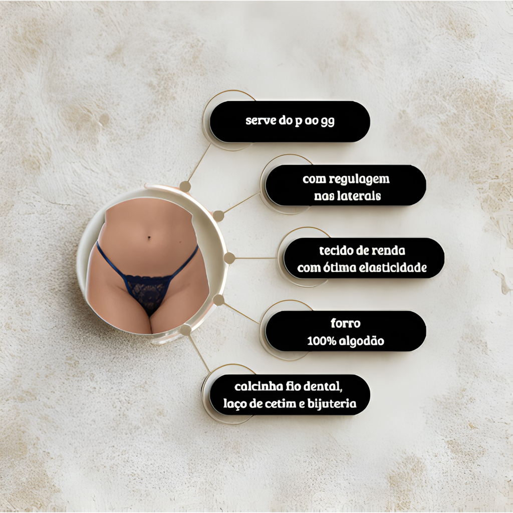 Calcinha Fio Dental Sexy de Renda Tanga Kamila com Regulagem e Laço de Cetim Descubra a perfeita combinação entre sensualidade e conforto com a Calcinha Fio Dental Sexy de Renda Kamila. Esta peça é ideal para a mulher que valoriza um toque especial em seu visual íntimo, unindo delicadeza e charme em cada detalhe. Destaques do Produto: - Design sofisticado: confeccionada em renda de alta qualidade, proporciona um acabamento elegante e sensual. - Alça fina com regulagem: ajuste personalizado que garante conforto e segurança ao usar. - Laço de cetim com bijuteria: detalhe exclusivo que adiciona um toque de glamour e sofisticação. - Modelagem fio dental: realça as curvas com delicadeza e ousadia, perfeita para valorizar a silhueta. Composição e Conforto: Feita com 90% poliamida e 10% elastano, a calcinha apresenta elasticidade e maciez, enquanto o forro 100% algodão assegura respirabilidade e conforto ao longo do dia. Cuidados com a peça: Para preservar a beleza e durabilidade da sua lingerie: - Lave à mão com cuidado - Não utilize alvejante - Evite passar a ferro - Não use secadora nem lave a seco - Deixe secar à sombra Tamanhos disponíveis: M (40-44) Importante: O padrão da renda pode variar conforme o estoque, garantindo exclusividade em cada peça. As cores reais podem apresentar pequenas variações devido às configurações de tela. Transforme seus momentos íntimos com a Calcinha Fio Dental Sexy de Renda Kamila — onde a elegância encontra a sensualidade de forma irresistível!