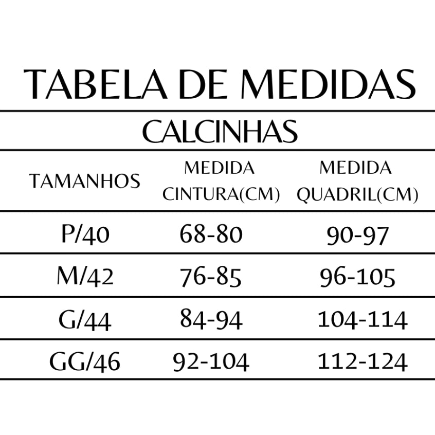SOBRE NOSSA EMPRESA Desde 1991 participante no maior polo de moda íntima do Brasil, a Gabi Lingerie tem como foco a sua total satisfação. Há mais de 30 anos no mercado de Lingerie, com peças de fabricação própria, matéria-prima selecionada, atenção aos detalhes, priorizamos qualidade, conforto e preço para nossos clientes. Desejamos que você experimente a melhor roupa íntima com todo conforto, poder e vantagens oferecidas por nossa marca para assim desfrutar de sua melhor versão. E aí? Você está preparado para esta experiência única? DETALHES DO PRODUTO: Tanga de Microfibra de Poliamida. Tecido leve, e geladinho. Modelagem perfeita para o seu corpo. Detalhes em renda na parte da frente. Modelo sexy, que desperta a sensualidade de qualquer mulher. Tanga Confortável. Não dá Bolinha. Flexível. Composição: 82% Poliamida 18% Elastano TAMANHOS: M veste 40-42 G veste 42-44 GG veste 44-46 Obs.: Para mais detalhes, como medidas da cintura e quadril, basta visualizar a última foto da postagem. DÚVIDAS DOS NOSSOS CLIENTES Qual o tempo de envio? Enviamos nossos produtos em até 24h após a confirmação de pagamento. Pode lavar na máquina? Para maior durabilidade do seu produto, recomendamos que a lavagem seja feita à mão. Para mais dúvidas, estamos à disposição no chat! Gaby Lingerie.