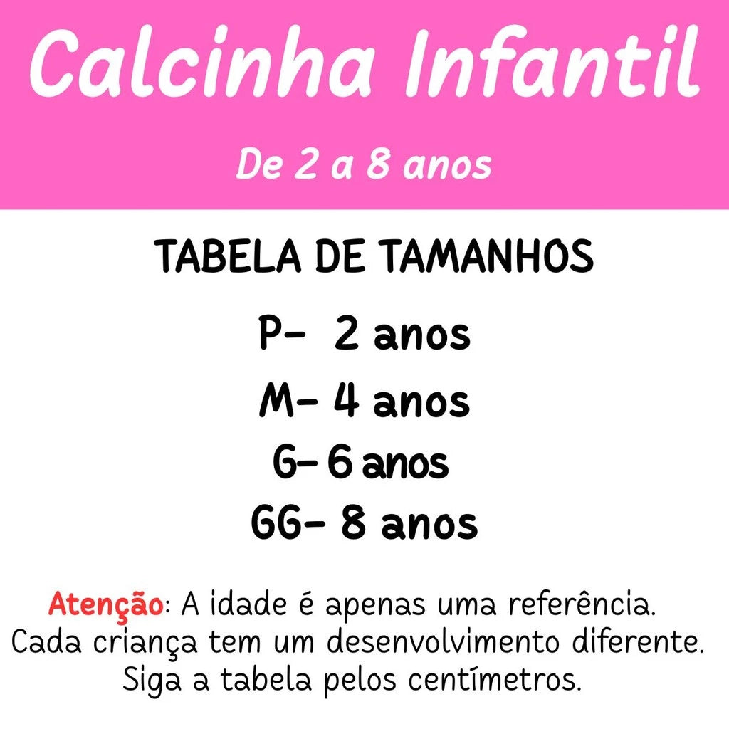 ENVIO IMEDIATO! COMPRE JÁ! Kit com 5, 10, 15 ou 20 calcinhas infantis - Deixe sua princesinha ainda mais linda e confortável com esse kit superfofo! São calcinhas infantis com estampas sortidas e encantadoras que as meninas vão amar. ‼️ATENÇÃO: Cores e estampas enviadas de forma variada, podendo ser diferentes das exibidas nas imagens do anúncio. Conforto e Qualidade: Produzidas em Malha PV (malha fria) forrada, essas calcinhas oferecem toque macio, excelente respirabilidade e conforto ideal para o dia a dia. Perfeitas para acompanhar a rotina das pequenas com muito estilo e bem-estar. ✨ Diferenciais: Modelagem confortável e prática, acabamento de alta qualidade, ideal para várias trocas ao longo do dia, alta durabilidade, não desbotado e tem baixo índice de encolhimento, costuras reforçadas e perfeitas. Composição: 67% Poliéster, 33% Viscose 📏 Tabela de Tamanhos (Referência por Idade): (As idades são apenas uma estimativa, já que o desenvolvimento pode variar de criança para criança) P: 2 anos M: 4 anos G: 6 anos GG: 8 anos